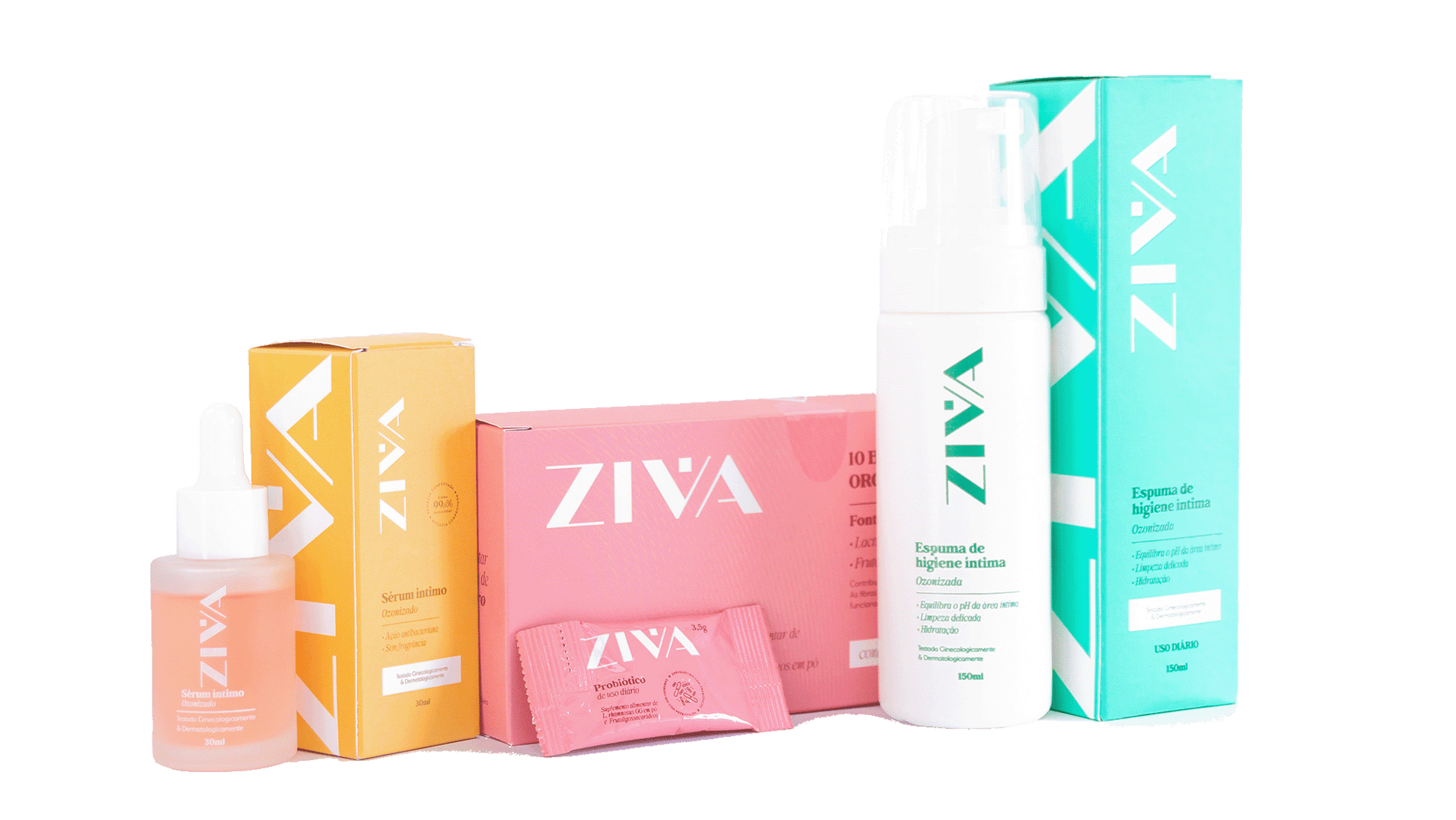 Trio completo: Simbiótico Íntimo Ziva, Sérum e Espuma Ozonizados, para um cuidado íntimo total. Alívio profundo, flora equilibrada e uma nova relação com o seu corpo.